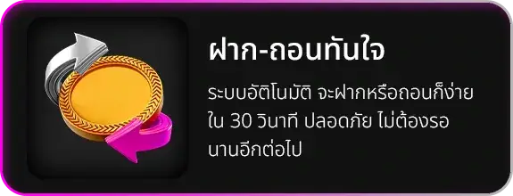 ตอบ : - ระบบอัตโนมัติทำรายการภายใน 30 วินาที - รองรับทุกธนาคารและ True Wallet - ไม่มีขั้นต่ำในการฝาก-ถอน - มีระบบตรวจสอบสถานะรายการ - ให้บริการ 24 ชั่วโมง